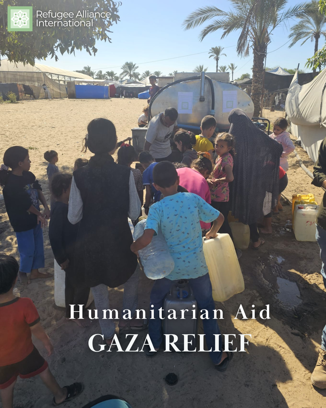 Water trucks supported by Refugee Alliance International provide safe drinking water to areas in need, helping protect against sickness from unsafe or polluted water.